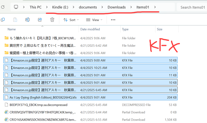 ダウンロード完了のkindle本がdocuments\Downloads\Items01の保存先から見つけます。